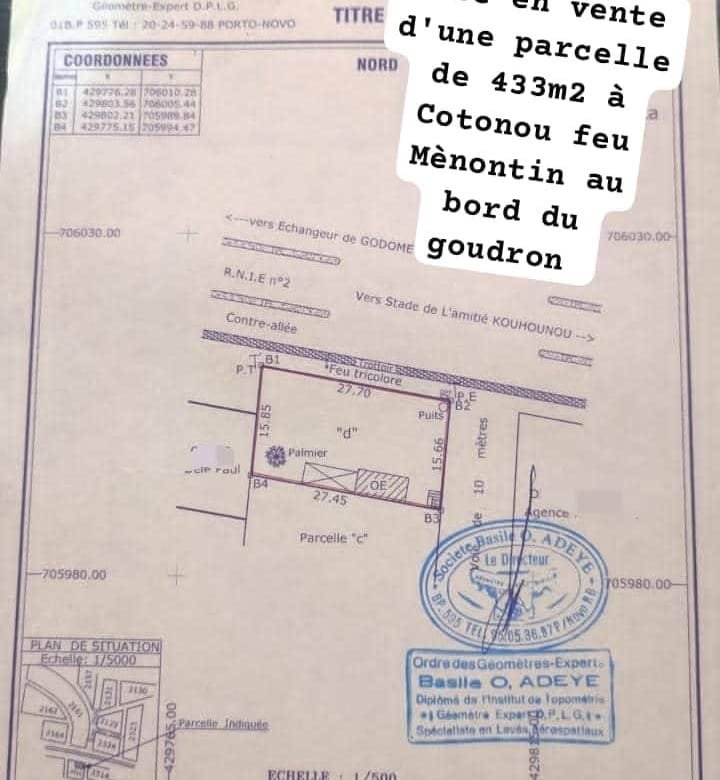 Parcelle de 433 m² avec TF à vendre à Cotonou Menontin