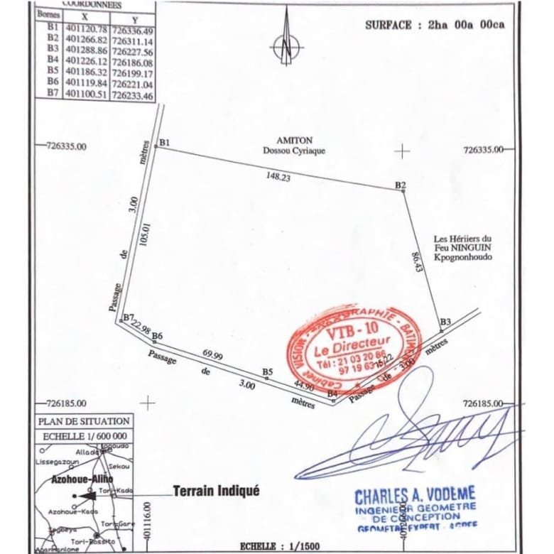 Une opportunité foncière unique est disponible à Tori Azohoue Aliho. Ce domaine de deux hectares est mis en vente pour le compte d’un propriétaire vivant. Sa situation, à seulement trois kilomètres du goudron reliant Tori à Allada, en fait un choix stratégique.